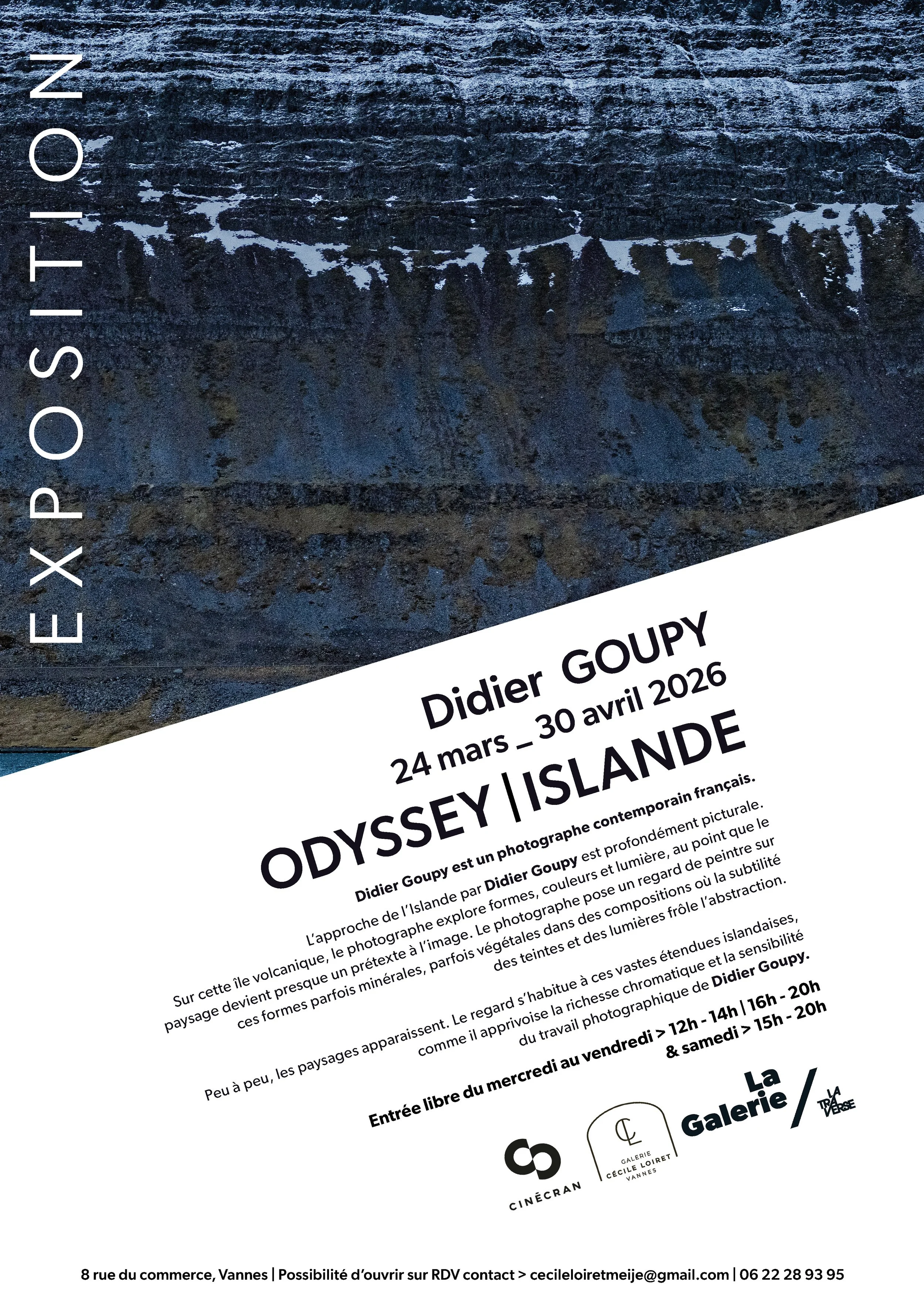 En écho aux Rencontres du cinéma européen, consacrées à l’Islande et organisées par Cinécran, la Galerie La Traverse, en collaboration avec Cécile Loiret, galeriste itinérante vannetaise, prolonge le voyage avec l’exposition de Didier Goupy, photographe contemporain français : ODYSSEY | ISLANDE.